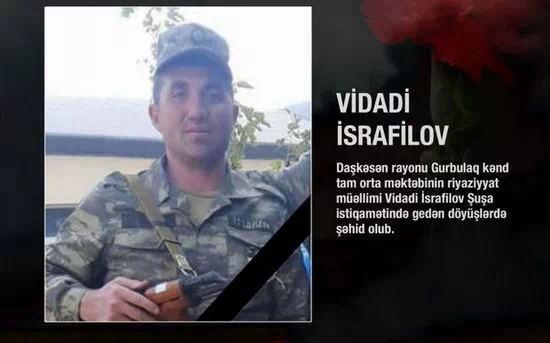 Təhsil Nazirliyindən bildirilib ki, Daşkəsən rayonu Gurbulaq kənd ümumi orta məktəbinin riyaziyyat müəllimi Vidadi İsrafilov Şuşa istiqamətində gedən döyüşlərdə şəhadətə yüksəlib.